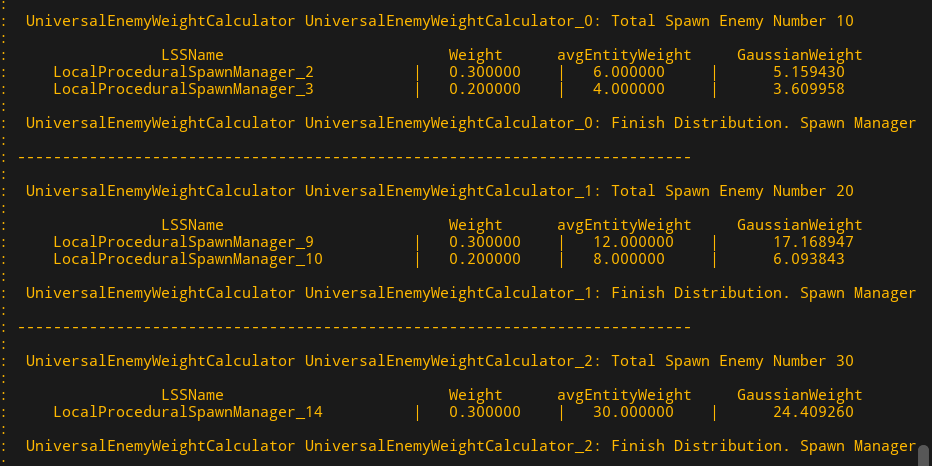 After level generation finishes, enemies get distributed to each area based on spawn points. Designers can assign a spawn weight to each enemy per spawn point. A higher weight increases how much spawn score that enemy consumes. I applied a Gaussian distribution to the enemy assignment process.