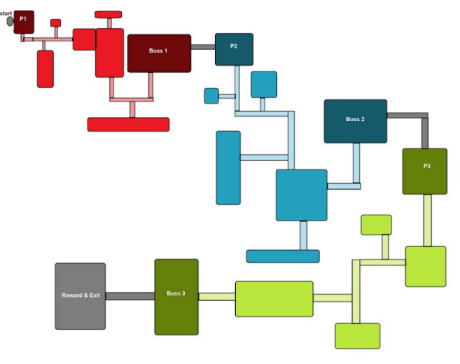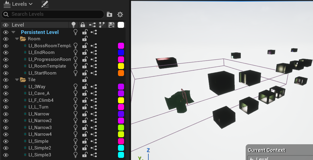 A rule-based 3D procedural level generator that creates areas in a fixed sequence with designer-controllable seeds. Uses collision detection and dead-end validation for spawn conditions. Each door receives up to 3 spawn attempts to prevent premature dead ends. Generation restarts entirely after 3 backtracks.