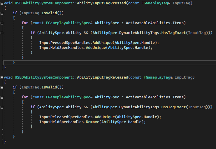 These two function will be bound to the input action by using BindAbilityActions function.