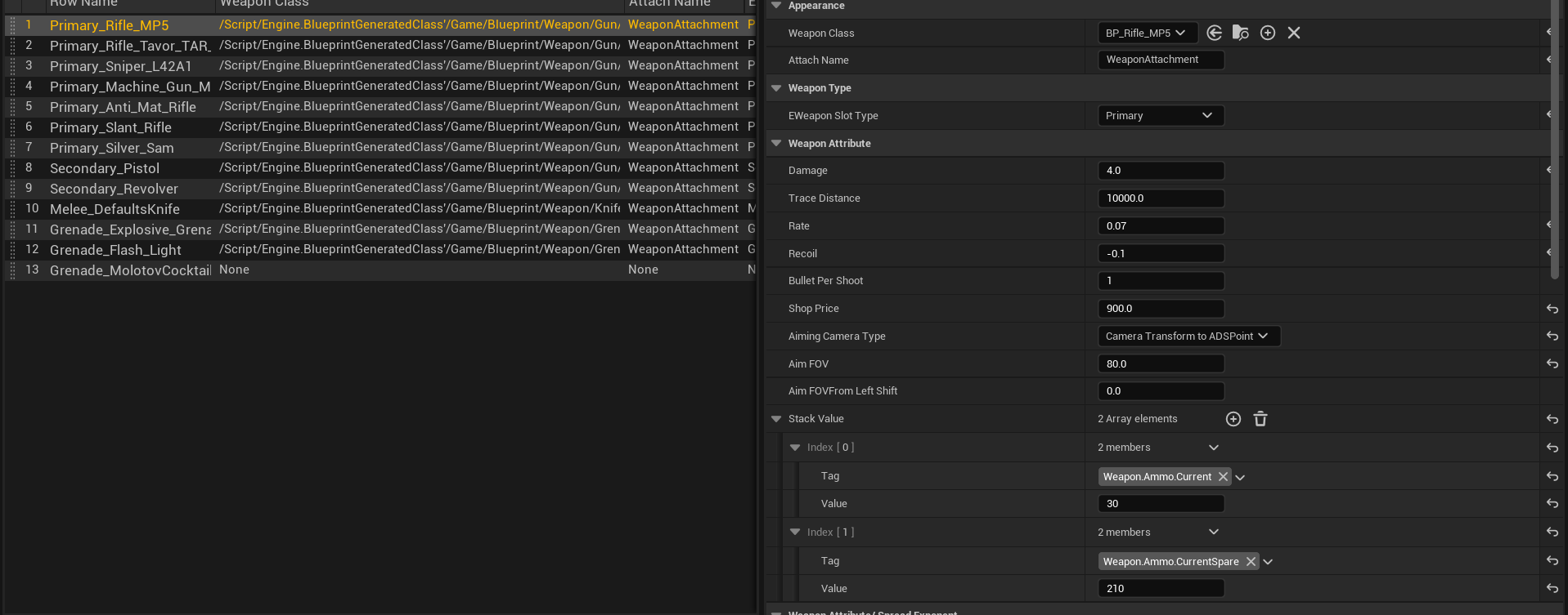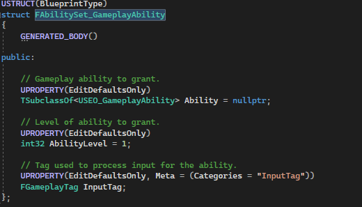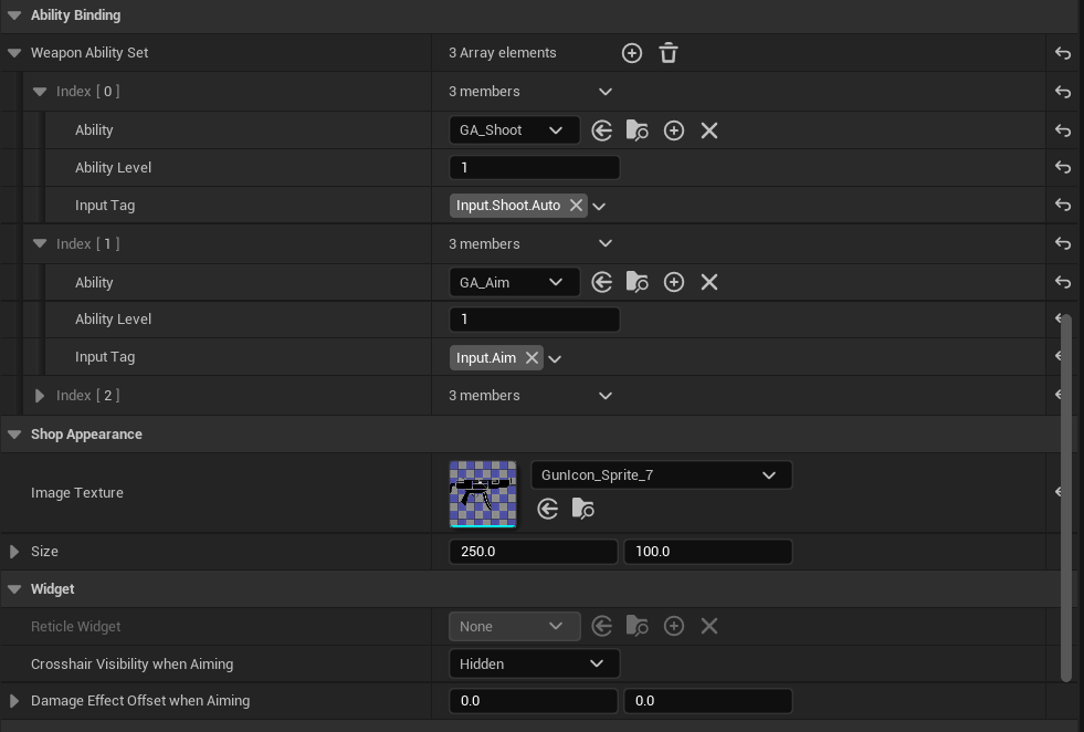 The first struct will be used to determine the ability granted to the Gameplay Ability System. Each weapon will grant or remove their ability when player swapping weapon. Same ability may contain different of ability level for different weapon as well.