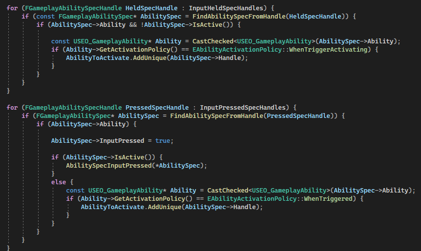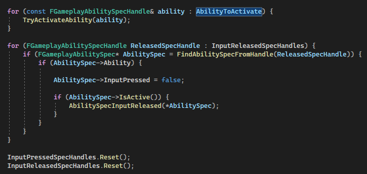 It is time to talk about the process of how the ability activate. The ability that held in InputPressedSpecHandle and InputHeldSpecHandle will being loop and added into the AbilityToActivate array.