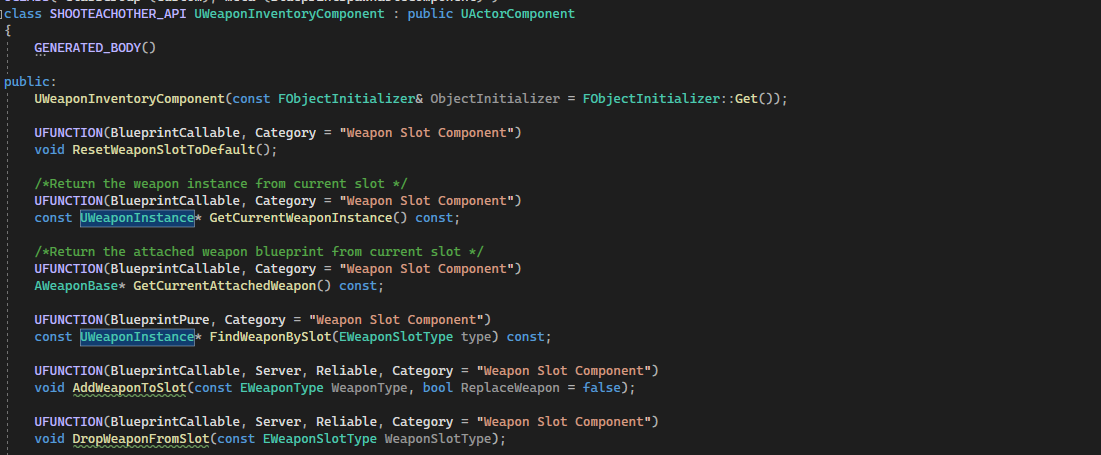 A WeaponInventoryComponent will be used to manage all the weapon related data. Each weapon will represent as an UObject called Weapon Instance. WeaponInventoryComponent will be responsible for switching between weapon as well.